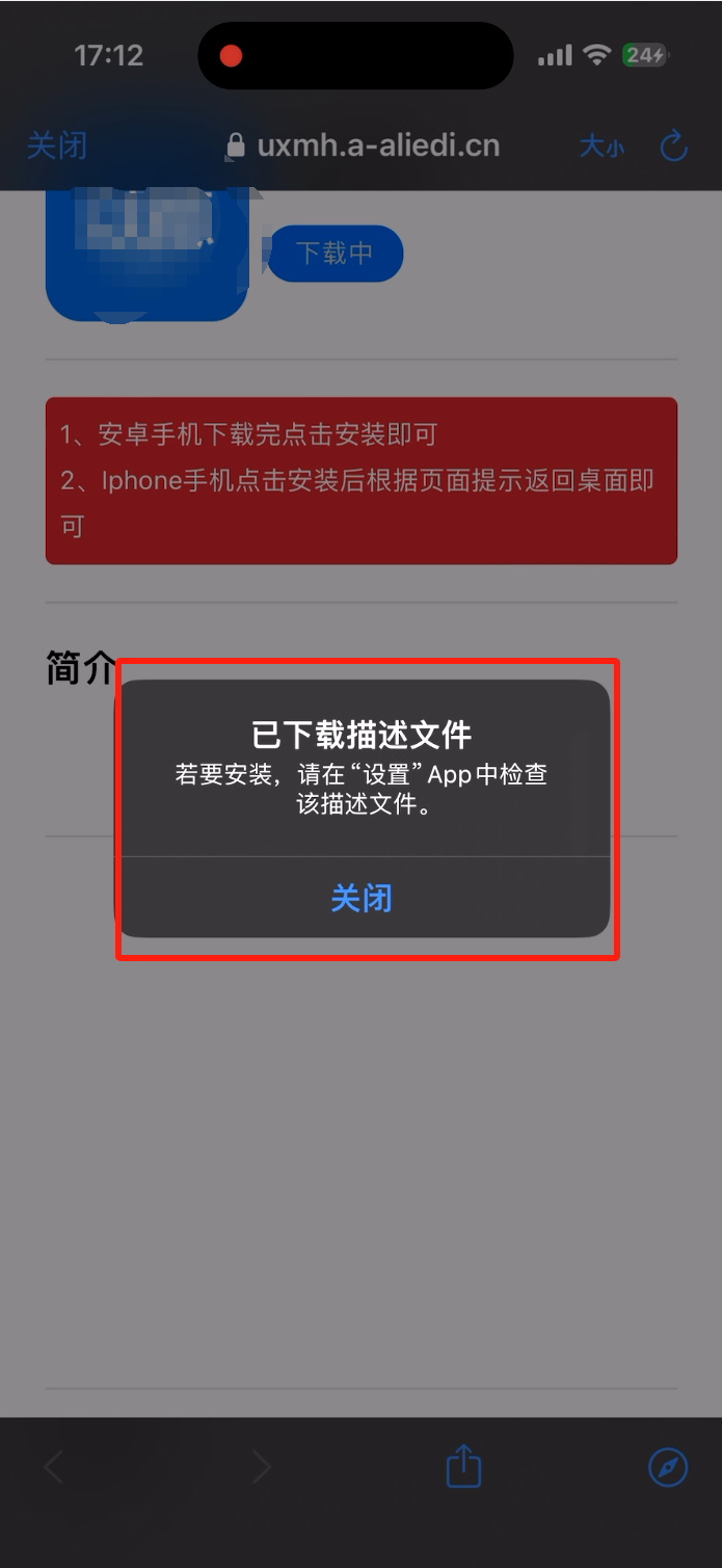 进入手机设置,点已下载描述文件,弹出安装界面,点击安装即可。