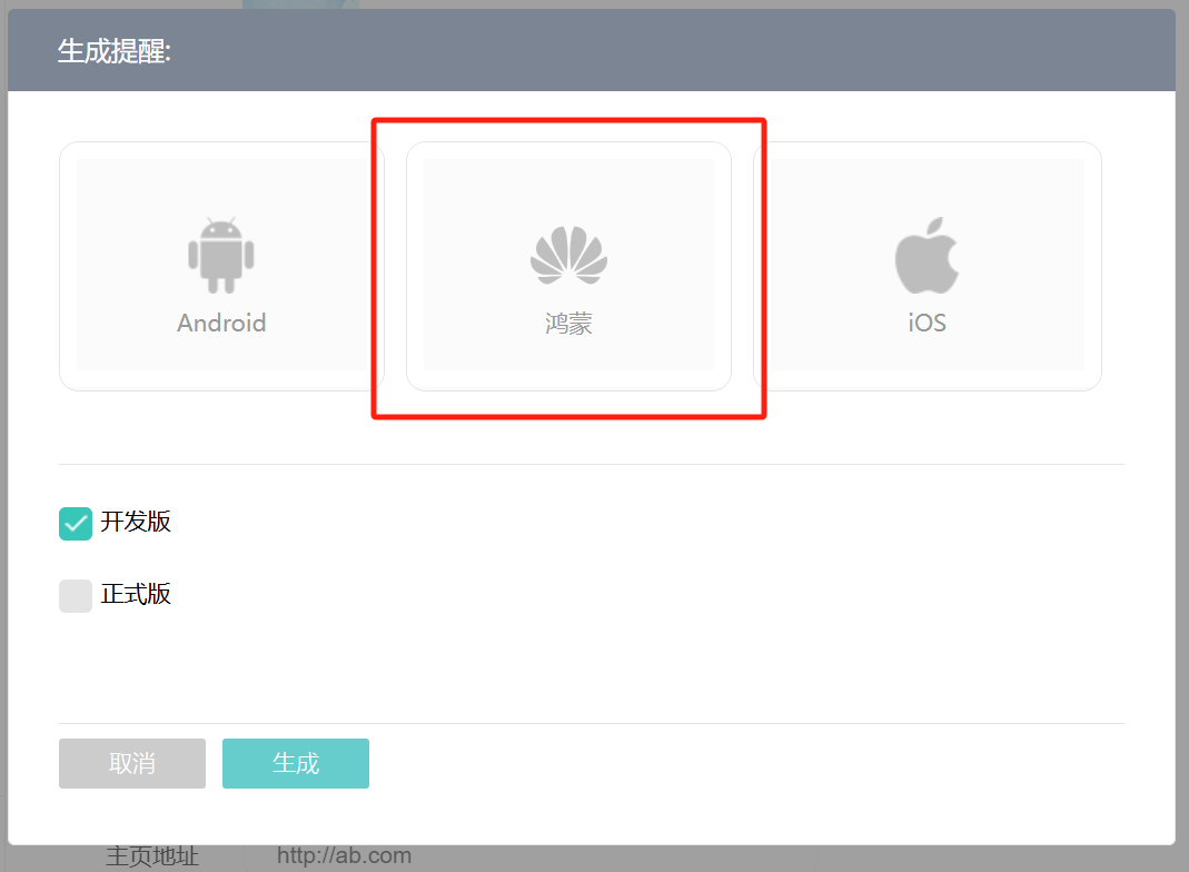 保存后选择鸿蒙生成即可生成鸿蒙APP